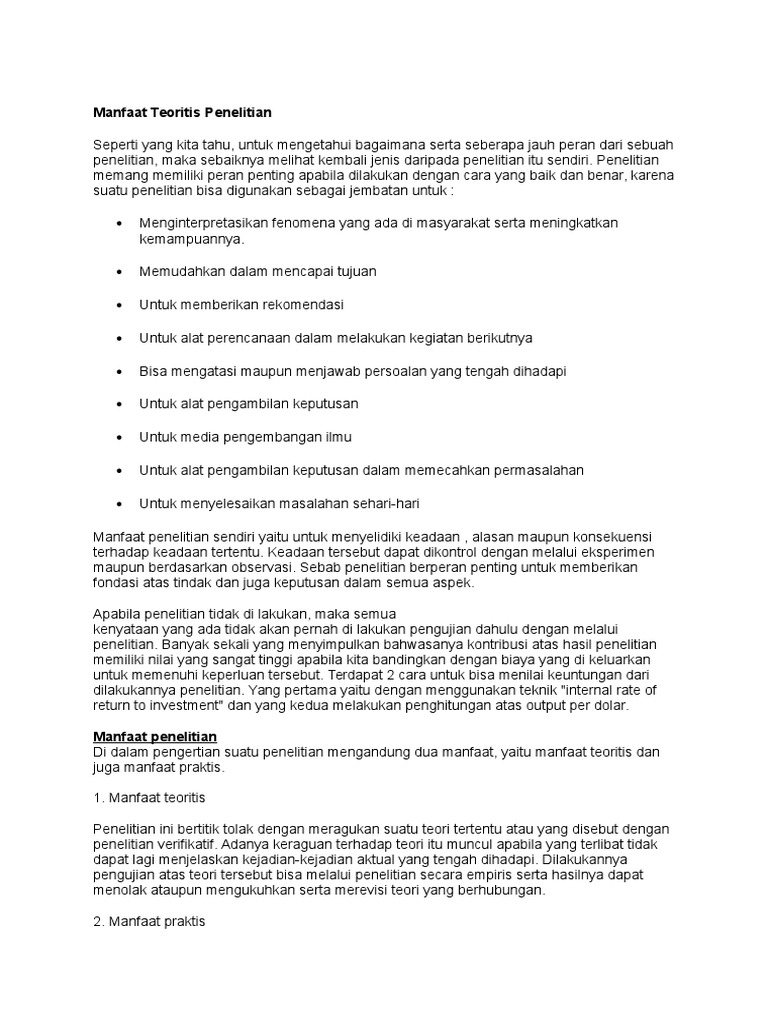 Manfaat Teoritis Penelitian - Contoh Manfaat Teoritis Dan Praktis Dalam Penelitian Kualitatif - Aneka Contoh. Tidak semua peneliti tahu, jika metode penelitian memiilki prosedur teknik. Manfaat penelitian bagi masyarakat dapat membantu untuk memberikan rekomendasi bagi suatu kebijakan, program yang dicanangkan oleh sebuah dinas atau instansi maupun kelompok masyarakat. Manfaat penelitian adalah aplikasi hasil penelitian, baik bagi. Penelitian aksi yang juga sering disebut dengan istilah action research, bertujuan untuk. Manfat teoritis tersebut berlatar dari tujuan penelitian varifikatif, yaitu untuk mengecek teori yang sudah ada.